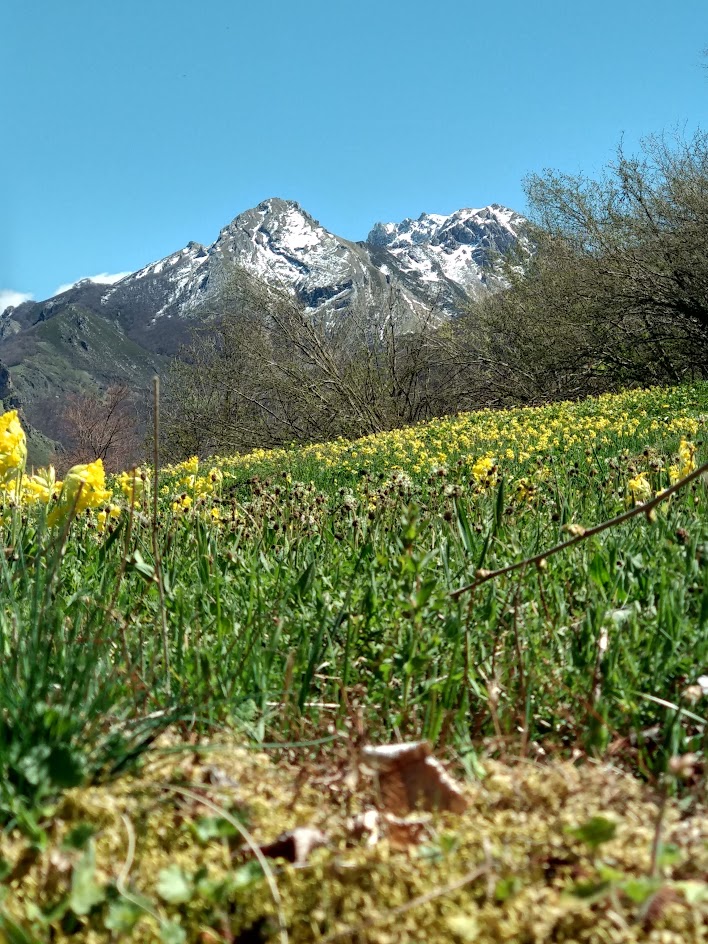 brañas de Mumián, atravesando Llamardal, a través de la senda PR AS-11. Conforme ganamos altura, el bello panorama y el sol dulcifican nuestro humor, y nos dejamos envolver por los sonidos y paisajes de la primavera en las montañas. Atravesamos inclinadísimos canchales, orgullosos y verticales murallones de roca, y tras el esfuerzo, la senda que corta la ladera nos arroja a la braña, donde tenemos reservada mesa con vistas para 60.
