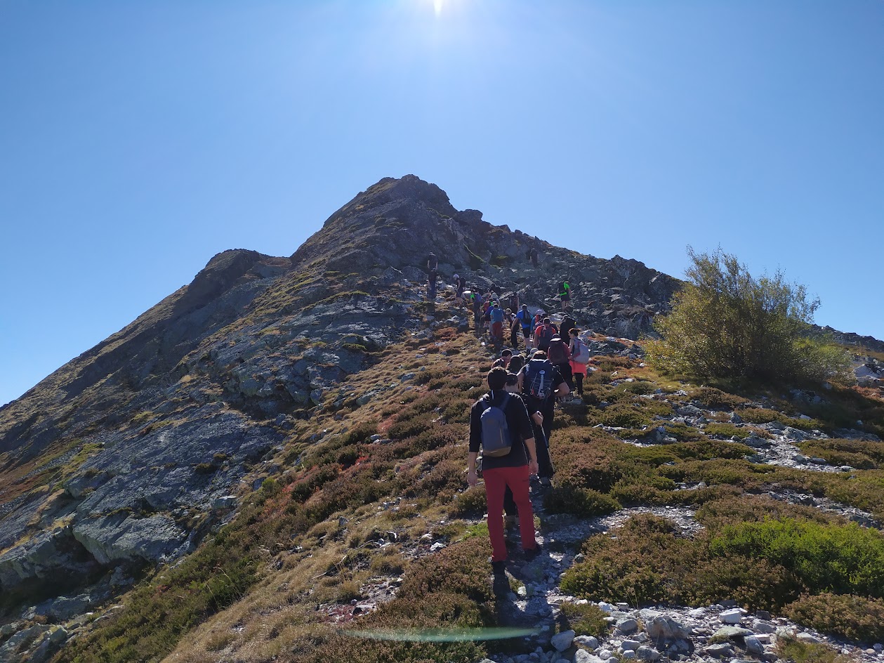 Pasando (y parando) previamente por la cumbre Norte del pico, posteriormente, con un ritmo muy relajado, atacamos la cumbre principal. No tenemos prisa ninguna. Llegamos arriba en el momento perfecto: la hora de comer. Fotos, conversaciones, bocadillos, paisajes abiertos. También