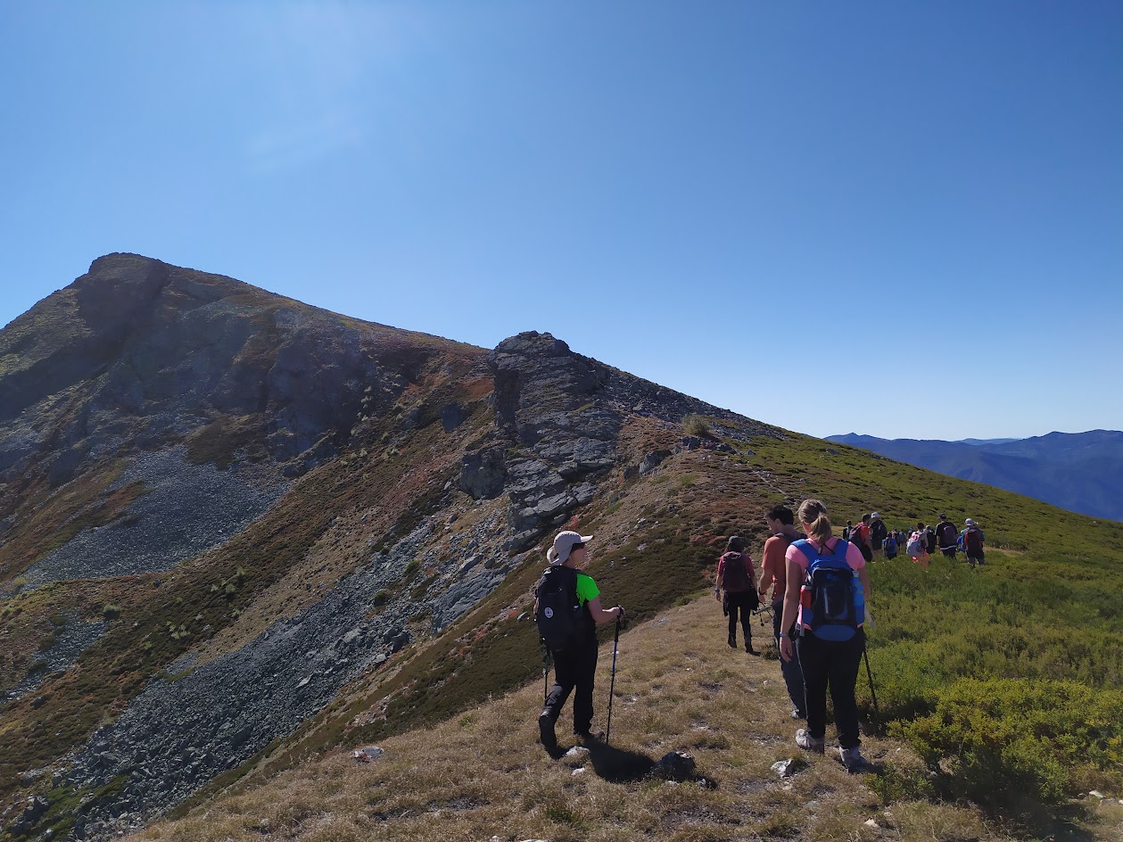 Llegados al colláu, un viento fresco otoñal nos reconforta y las pendientes se relajan. En este punto, seguiremos la cresta del monte en dirección Sur. Caminando en sentido contrario se llegaría al Cornón (2188 m), techo de esta zona de la cordillera en rivalidad con Peña Orniz. Intentamos evitar las enormes rocas que se nos cruzan por nuestro camino y atravesamos, mal que bien,