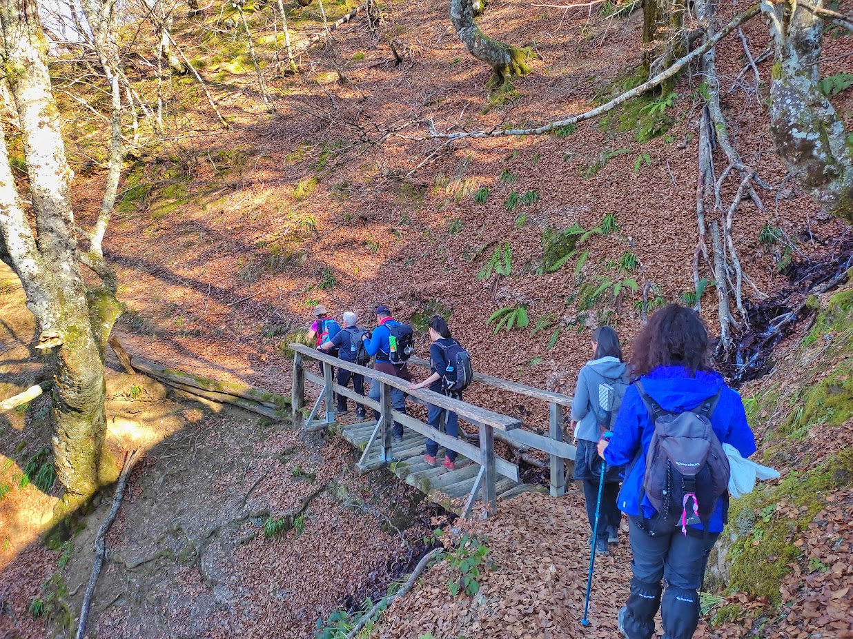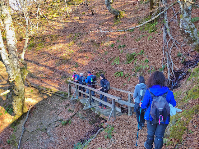 Cruzamos un puente de madera precioso, por el bello lugar en el que está, por la madera, la estructura y disposición de la misma, los saltos de agua del arroyo, la hoja caída que adorna dicho enclave, la estampa gélida que nos proporciona el hielo aún presente en las zonas sombrías, por absolutamente todos los detalles de este lugar MARAVILLOSO.