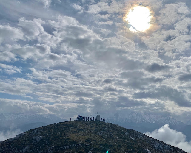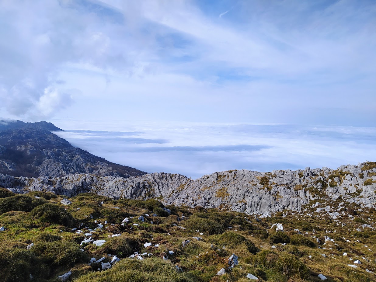 Llegaremos a la majada Rozagás (1.080m) de altitud y después de atravesar una zona de jous y torcas con los que nos deleita el paraje kárstico de la sierra del Cuera y dejar Peña Llacia a nuestra izquierda llegamos al collado previo al Turbina donde dejaremos las mochilas para acometer el ascenso final, tan solo nos quedan 100 metros para la cumbre, como nos gusta sortear la caliza. La sierra del Cuera nos ofrece un terreno muy exigente para el tren inferior, cada paso dispar. Una ayudita de los bastones y al fin arriba sacando un millón de fotos.