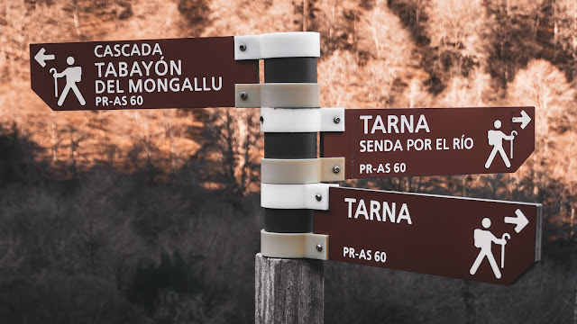 La idea primigenia era llegar a Vega Pociello desde el pueblo de Tarna, dejando a nuestra izquierda el camino que lleva al monte Saperu y al Tabayón de Mongallu. Pero las marcas amarillas y blancas nos estaban llamando cual sirena. Marcas del PR AS-60 que lleva al tabayón de Mongallu. Pronto nos adentramos en el bosque Saperu, que se está ubicado en la falda de la sierra de Mongallo, donde el haya es protagonista.