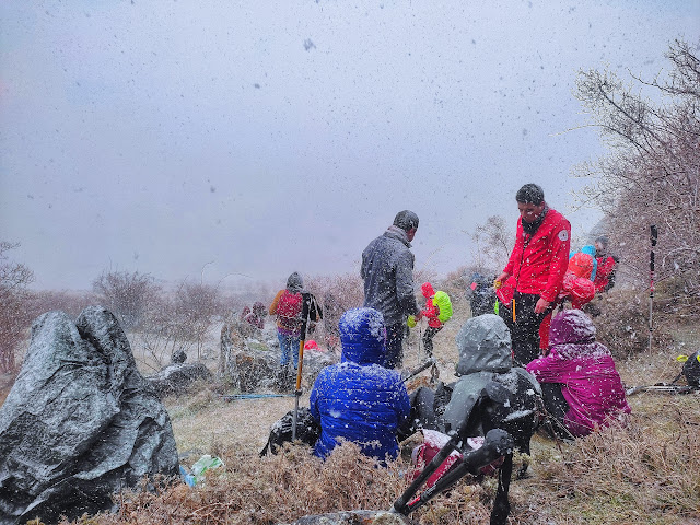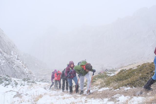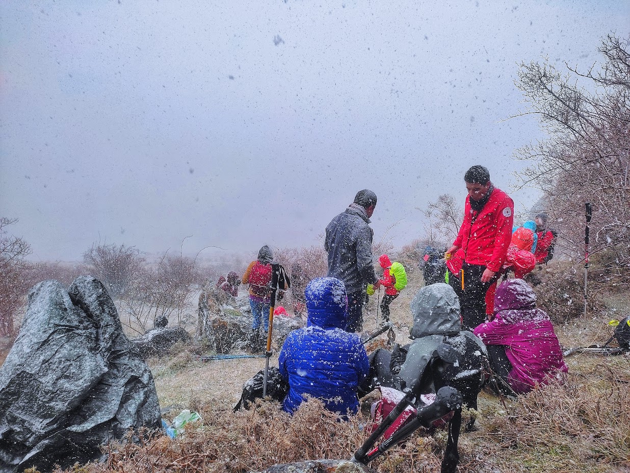 Comenzamos a descender hasta llegar a una zona ligeramente resguardada por rocas, algún árbol y protegida por una imponente pared a nuestra derecha, aquí empezaremos a comer mientras cae una aguanieve que con el paso de los minutos se torna a nieve. ¡Qué estampa!