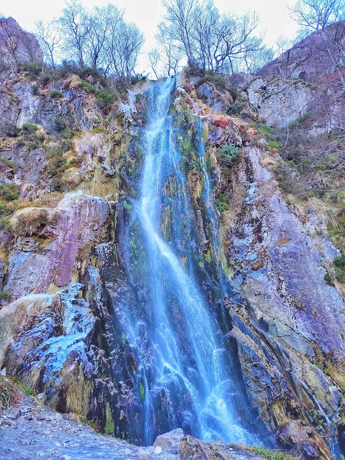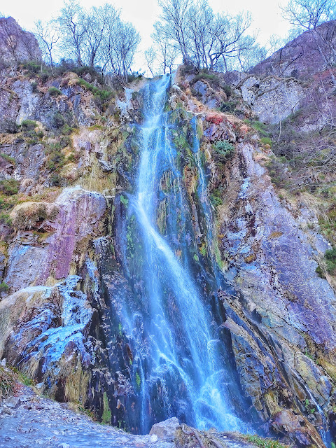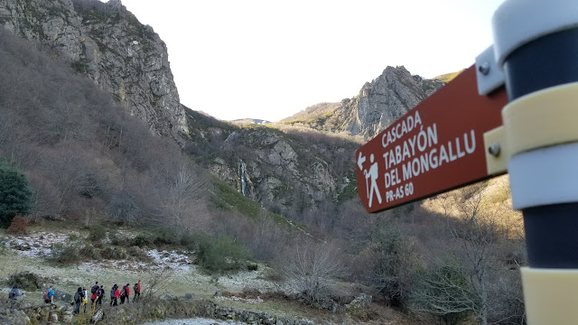 Siendo tabayón el término que designa cascada en asturiano y Mongallu, monte de gallo, refiriéndose al urogallo muy presente en el concejo de Caso, también es el nombre del arroyo cuya cascada nos maravilla. Vemos a su derecha el Cueto Negru. Las aguas se precipitan de más de 60 metros. No podemos acercarnos mucho a la cascada pues el hielo nos dificulta el camino, de hecho alguno de nuestros habituales prueba por sí mismo la peligrosidad del suelo helado cercano a la base del tabayón, en un intento por sacrificarse por el bien la manada.