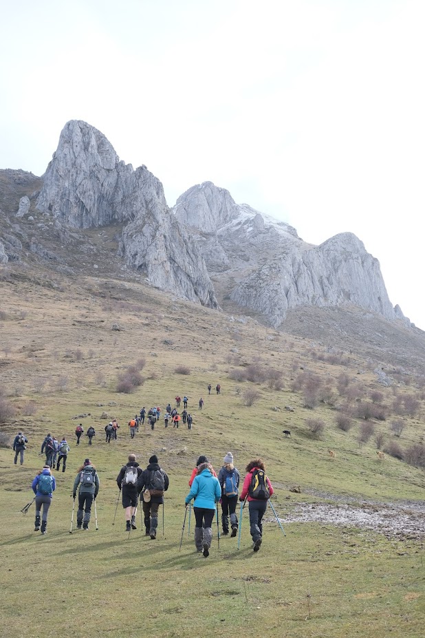 Polainas aparte, tenemos que ponernos en marcha pues el viaje en autobús fue largo y ya es hora de caminar. Ni un respiro nos da la sierra del Cuera que nos golpea con 400 metros de desnivel y por la solana, así para empezar, quitamos ropa y a seguir subiendo. Continuaremos por la pista de hormigón hasta llegar a una cabaña bien conservada de la majada las Vegas donde abandonaremos la pista para seguir la “canal” del Gobiu. Ascendemos en zigzag, una vez superada abandonamos la canal caminando hacia la derecha, sorteando cotoyas, brezos y alguna escoba que no nos impidieron avanzar. El invierno es muy buena época para venir al Cuera; magníficas vistas de nuestros Picos de Europa nevados y el matorral retraído y apocado por la frescura de las noches invernales. Ya estaremos acercándonos a la parte alta de la sierra del Cuera (1.060m).