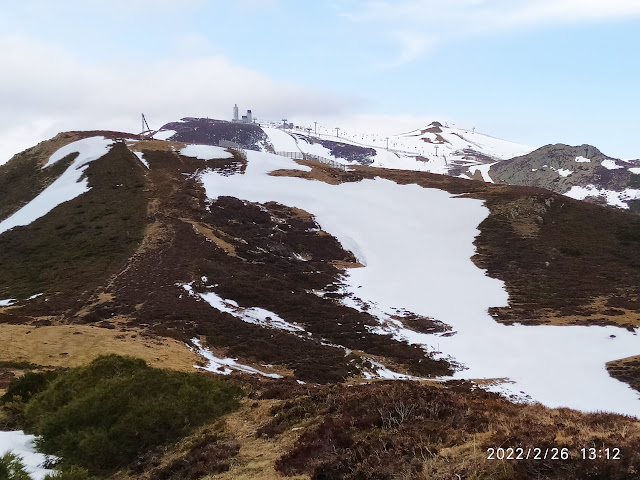 Hace frío así que pronto nos toca bajar y el matorral nos llama, cresteamos por un tramo de brezos, paramos a contemplar la estación de esquí de pajares con varios remontes en funcionamiento pese a la escasez de nieve y nos planteamos si continuar hacia el Cueto Negro, pico que se halla justo encima de la estación invernal o si bajar por la otra ladera entre escobas y más brezos. Como la cabra tira al monte la duda fue resuelta con rapidez.