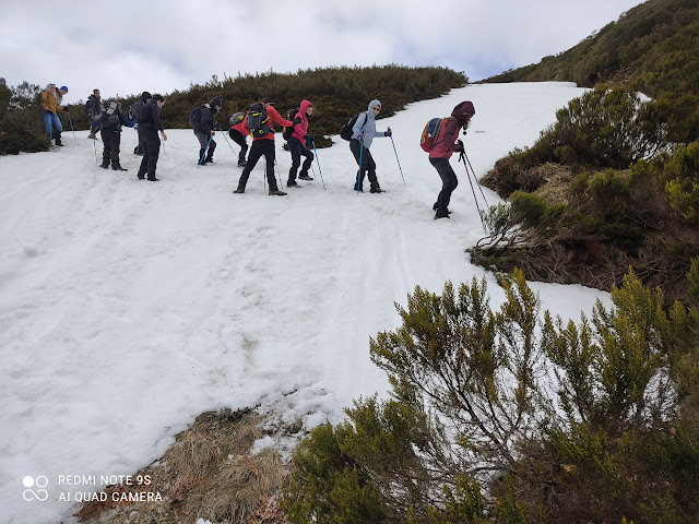 Avanzamos en ligero ascenso y a un ritmo ligero, paramos para reagruparnos y ya vamos vislumbrando la cumbre. Cubierta esta de un manto blanco, el último tramo lo realizamos por nieve, está perfecta para caminar.