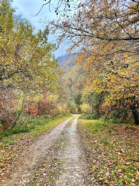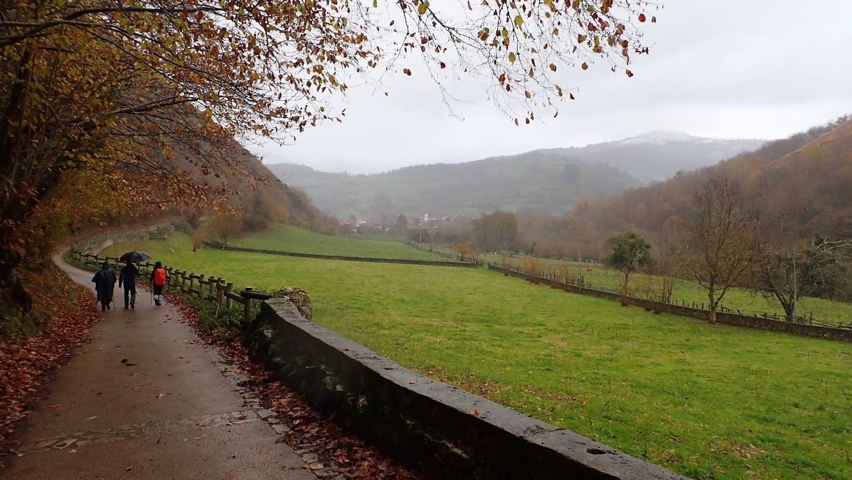 Cansados y pensando en la cena, atravesamos un bonito deshojado hayedo y cogemos una pista que nos lleva a la carretera de San Isidro, por la que subimos hasta alcanzar Cuevas y su mesón. Aquí siempre corre la sidra y la cerveza y huele a buena comida.