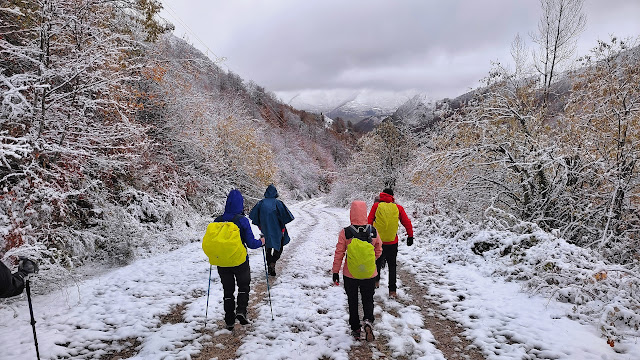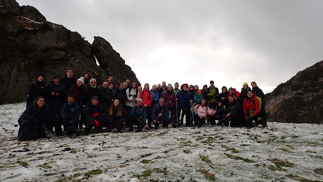 Salimos de Felechosa (después de la obligada parada para desayunar). Subimos la foz de Fresnedo por un precioso caminín que, por las últimas lluvias y el deshielo, de ser una escalera de piedras se torna en un auténtico riachuelo. Ponemos a prueba la impermeabilidad de nuestras botas, nuestro equilibrio y la impermeabilidad de nuestra paciencia.