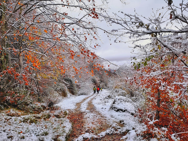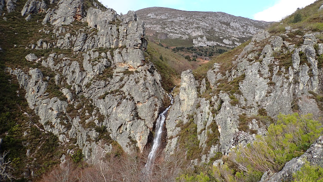 El sol desaparece un buen rato y, perezosos y con el frío en los huesos, reanudamos la caminata para ir "llaneando" por las laderas de la sierra que forma el Retriñón. Llegados a la braña la Tabierna iniciamos el descenso por un precioso camino que transcurre entre rocas enormes, cascadas, escobas y una preciosa y tenue luz de tarde otoñal.