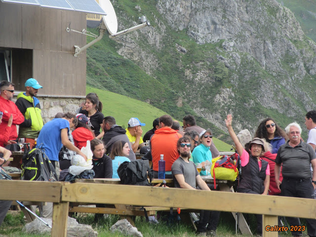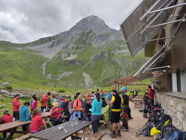 No sé qué nos pasa al pisar la cumbre que la bocona se nos empieza a hacer agua pensando en la cerveza y en la merienda. Azuzados entonces por esta fame atroz, salvaje y primigenia, y ante el peligro de que alguien se enfade o le pegue un mordisco a algo o alguien, bajamos a todo trapo al refugio del Meicín. En tripadvisor no tienen ni idea, si supieran de verdad de lo que es manducar estaría como número uno indiscutible de nuestra tierrina astur.